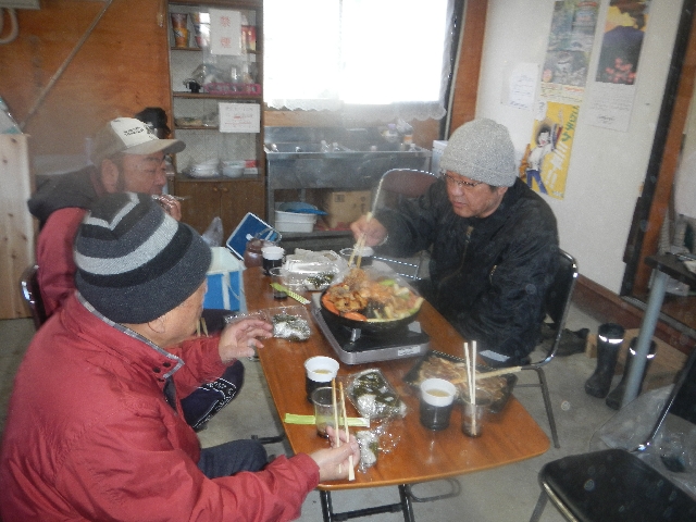 冷えた体はジンギスカン鍋で腹ごしらえ・・・遅い昼食と釣り談義!